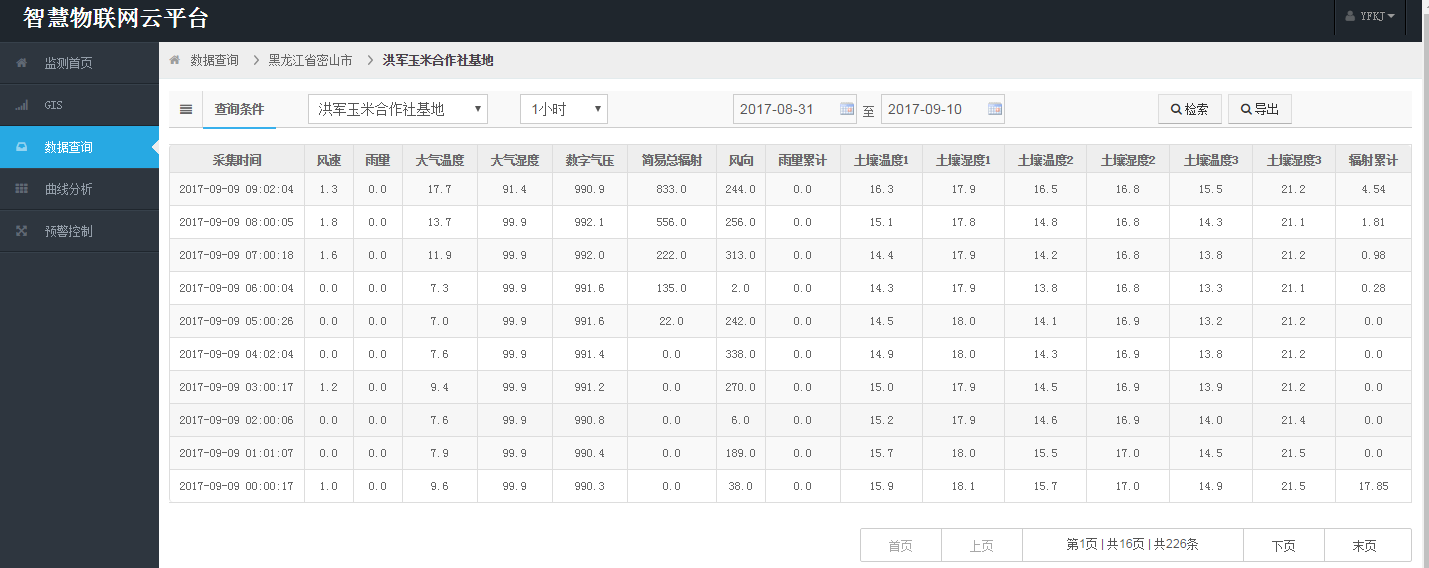 用戶可以通過區域管理,在全國詳圖中迅速定位所屬站點,打開圖標可顯示站點的實時監測數據,可按照時間段查詢和下載歷史數據,通過曲線圖,柱形圖或餅狀圖進行數據展示和分析,建立大數據庫,指導農業生產。